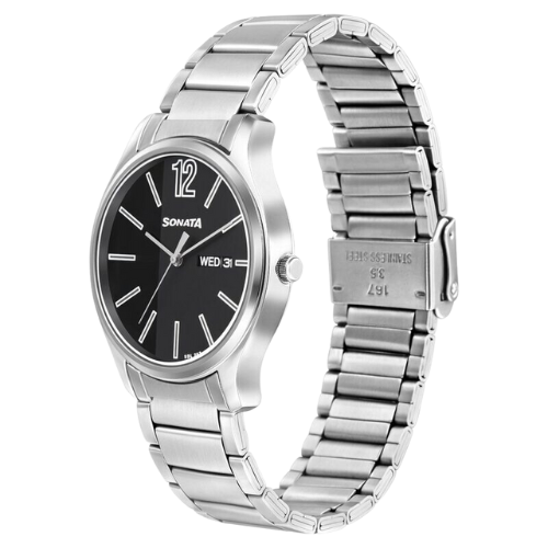 - Name:Sonata Quartz Analog with Day and Date Black Dial Stainless Steel Strap Watch for Men